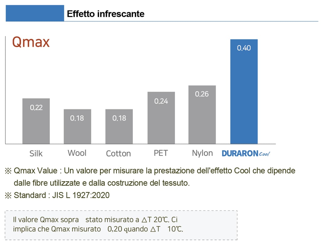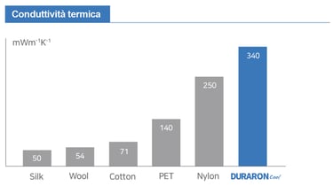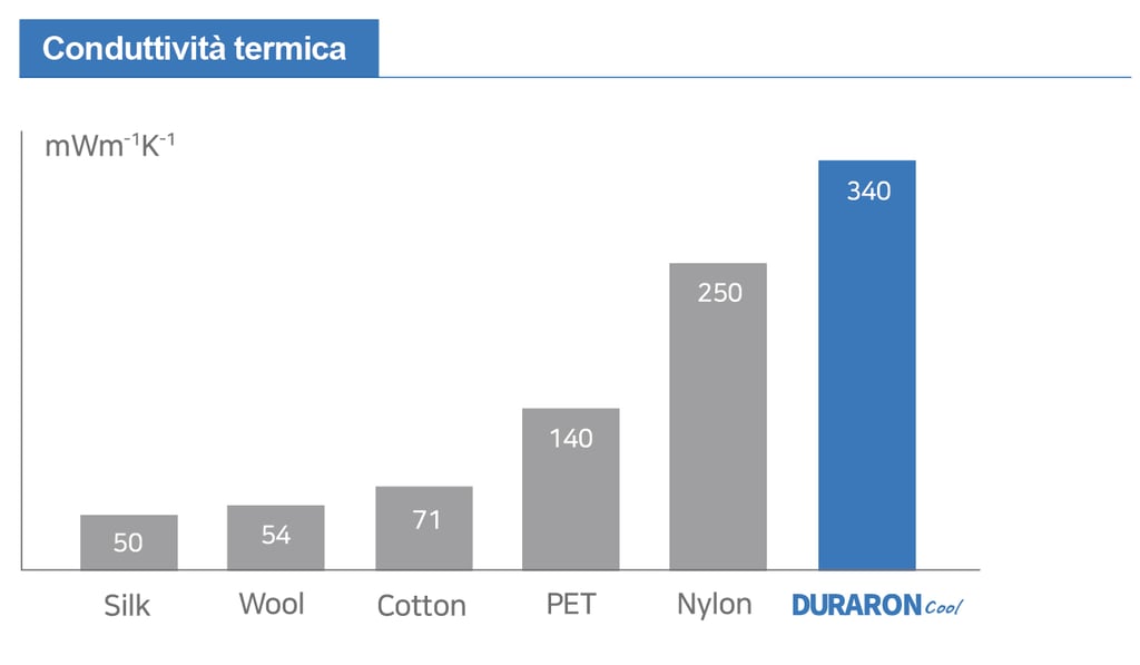 La sensazione di freschezza è massima, poiché DURARON Cool ha una conduttività termica superiore rispetto ad altre fibre.