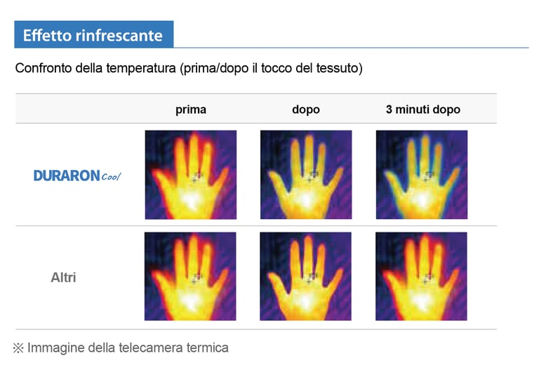 Grazie alla convezione termica tra la pelle e il tessuto, DURARON Cool ti regala una sensazione di freschezza ogni volta che tocchi il tessuto.